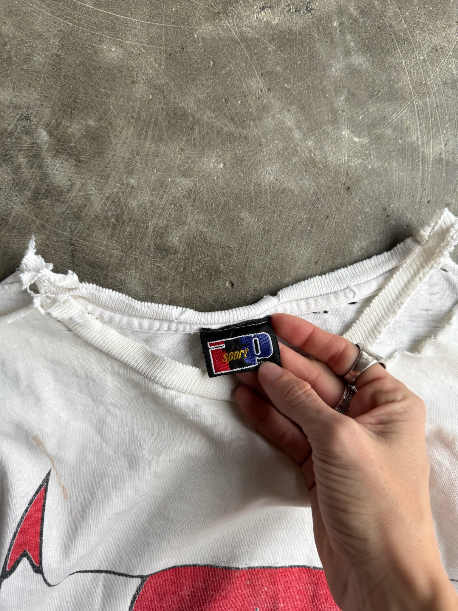 Heavy distressing and rip in neck area.
